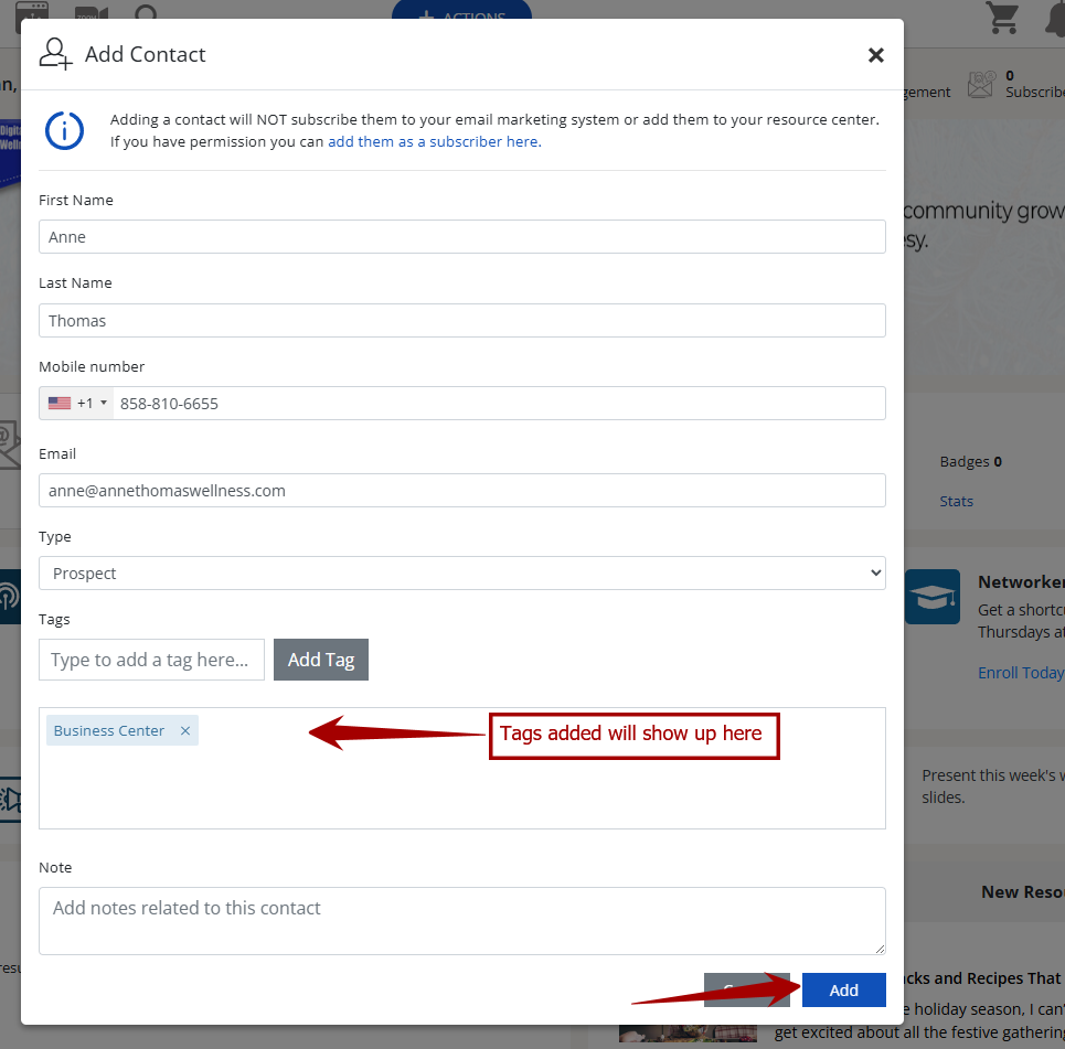 Type. Adding Tags can help you categorize your contact and you can also add a note related to the contact. Once done, click